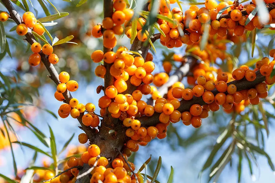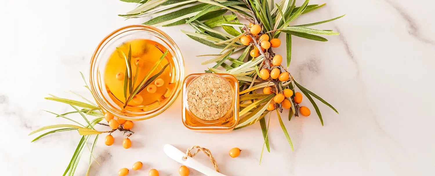 Darüber hinaus enthält Sanddorn auch Vitamin E, das die Haut mit Feuchtigkeit versorgt und dazu beiträgt, den natürlichen Feuchtigkeitsgehalt der Haut zu erhalten. Vitamin E wirkt auch als Schutzschild gegen Umweltschäden und beruhigt gereizte Haut.